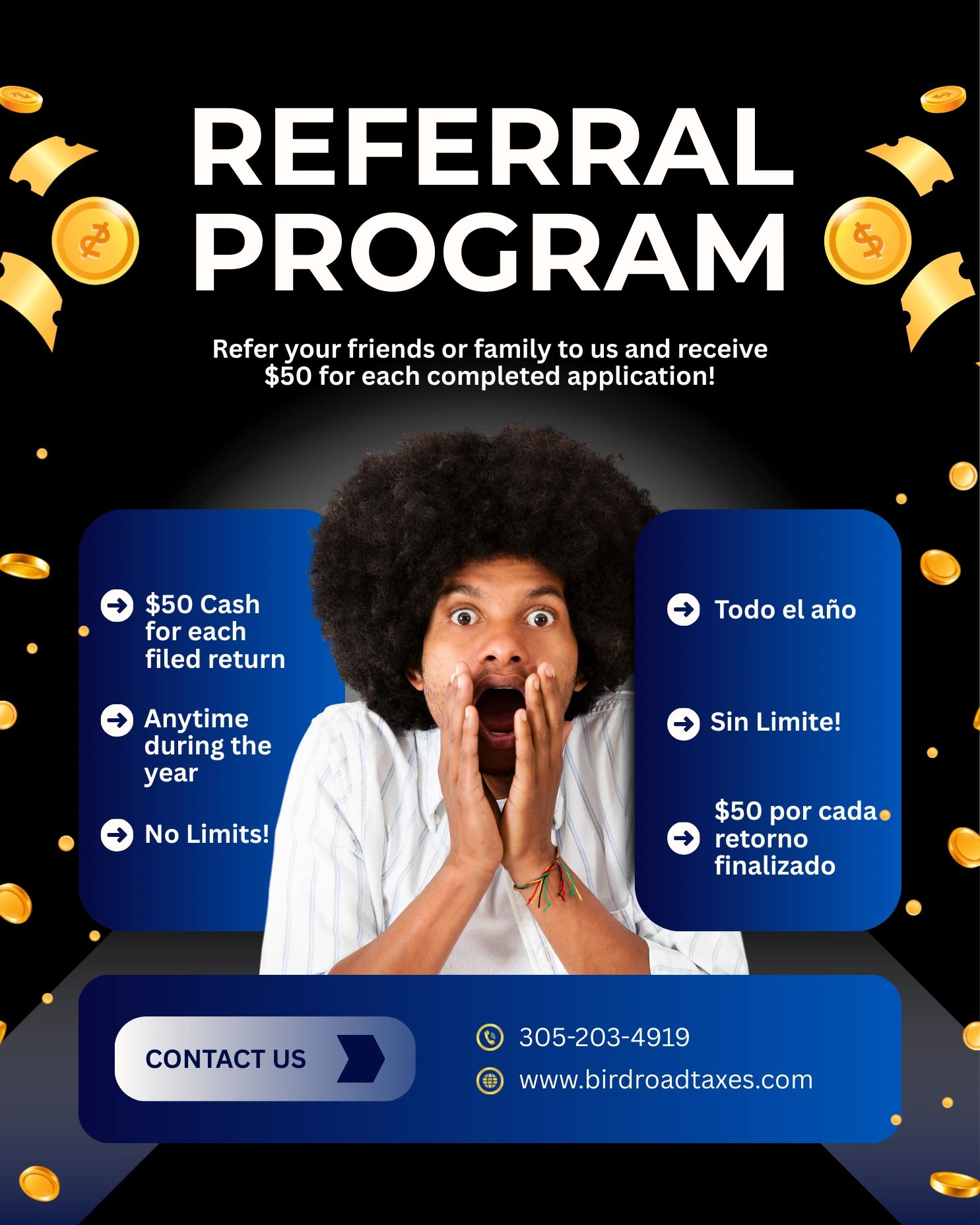 Our referral program puts cash in your pocket! Every time you send a friend or family member to do their taxes you earn $50 dollars, no limits, no gimmicks, as soon as their completed signed application is submitted you are eligible to claim your money.